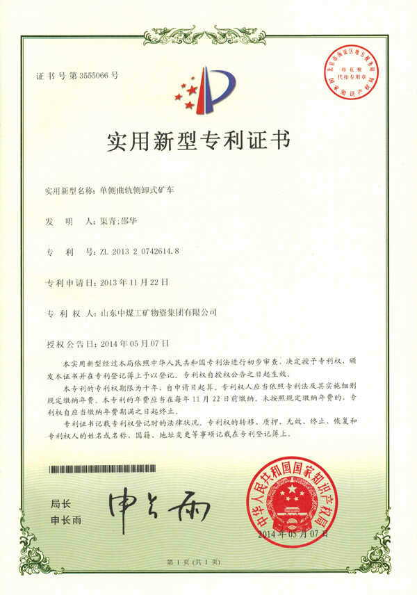 近日,经国 家知识产权局审核批准,山东中煤工矿集团——单侧曲轨侧卸式矿车荣获实用新型专利证书。